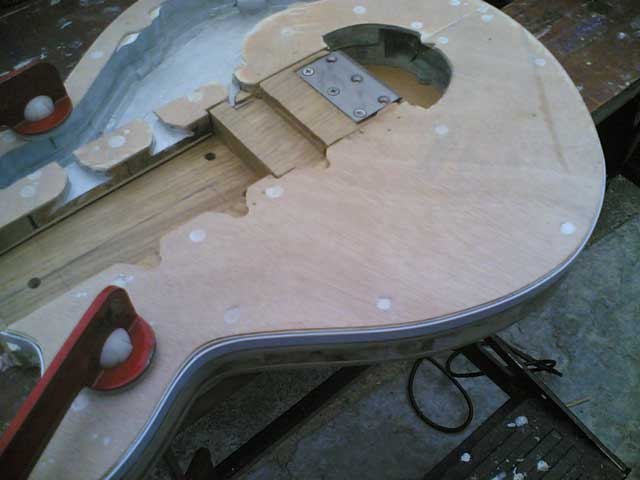 Finally for today, we glued and nailed the tremolo cavity cover on the back of the guitar.