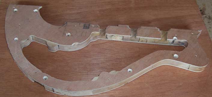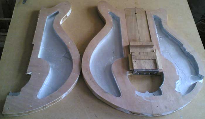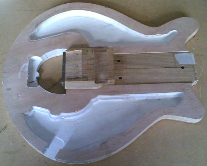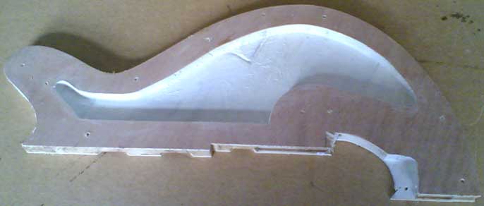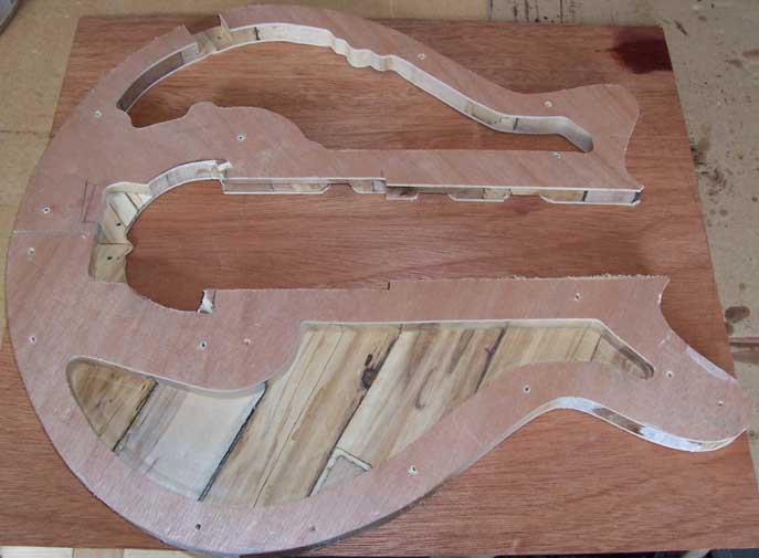 To start today we decided that we needed something to support the veneer on the back of the guitar where the tremolo cavity is. To be honest, we should not have routed through the entire body when doing this in the first place. So, we started off by creating a recess for a 'lid'. We achieved this by using a router with a guide-bush. So, we had to rig something for the guide-bush to follow, as shown below.