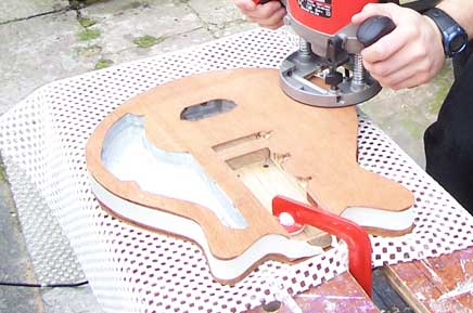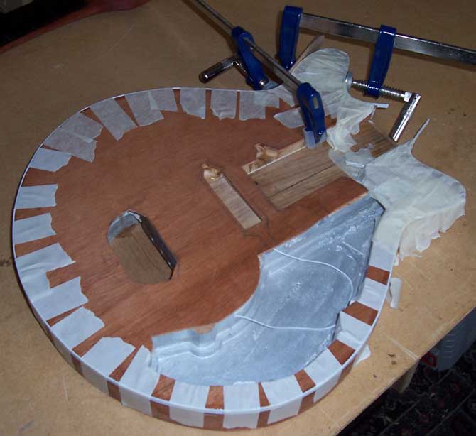 Our main task today was to route both binding channels, and add at least one of the bindings. Unfortunately the router bit/bearing would route a 2mm channel. The binding that I have is only 1.6mm, so we added 4 layers of masking tape around the body to add 0.4mm for the router bearing to cut the necessary 1.6mm channel. The first picture below shows this. The second picture shows the channels finished.