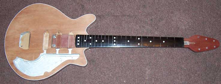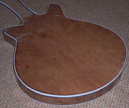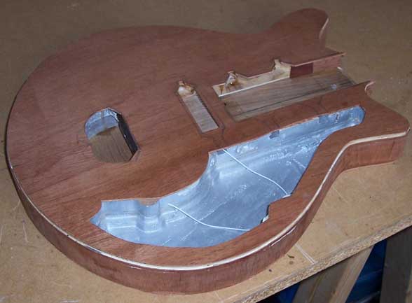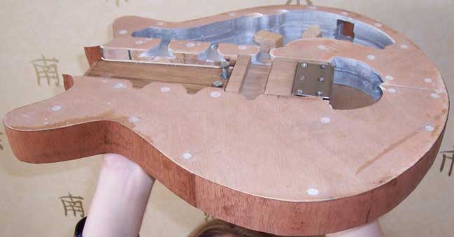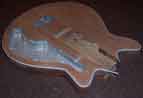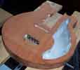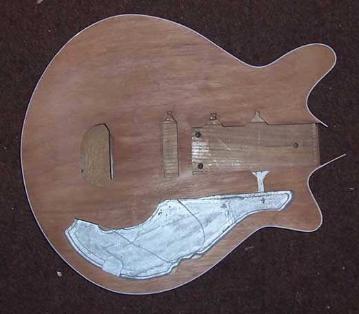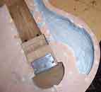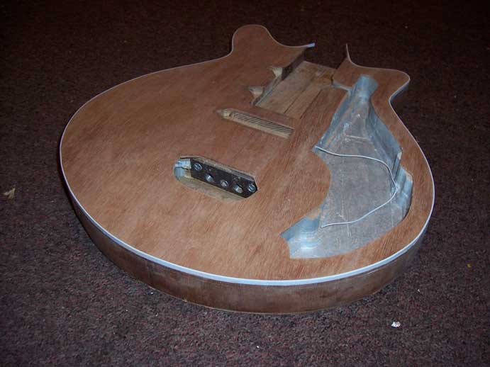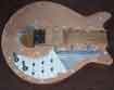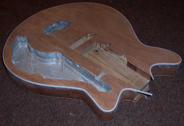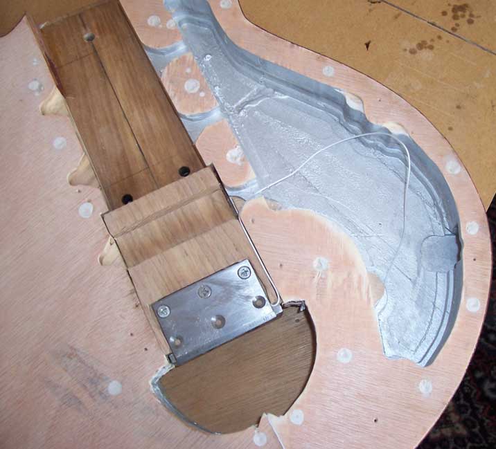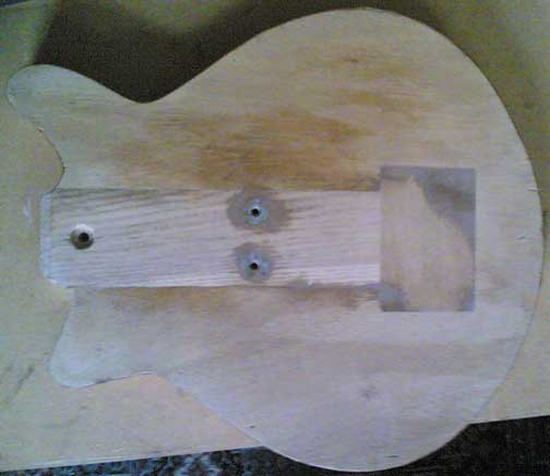 Neck we sanded down the back of the body prior to adding the veneer. The very dark areas on the picture below show where the we added the wood filler.