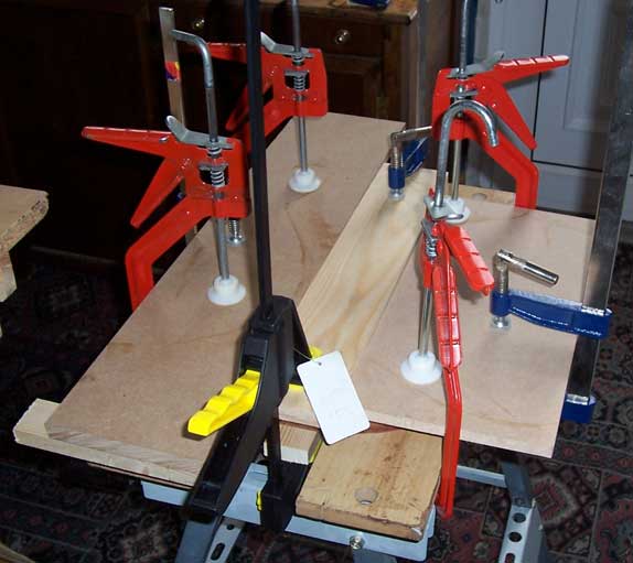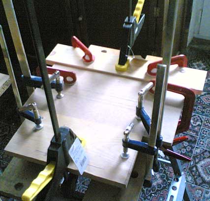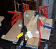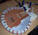 We now applied the warm glue to the body and stuck down the veneer. In doing this we squeezed out all the air and excessive glue, before clamping it down with strips of wood.