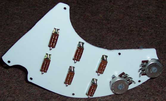 Once that was done I screwed them to the control plate, as well as the pots. Then I started soldering the wires.