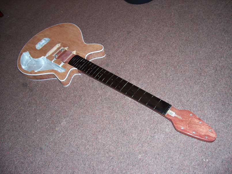 This next task was to glue the binding to the body. This proved to be very VERY frustrating as the binding wouldn't actually stick to the wood, and wouldn't keep it's shape. But eventually we got it all glued on.
